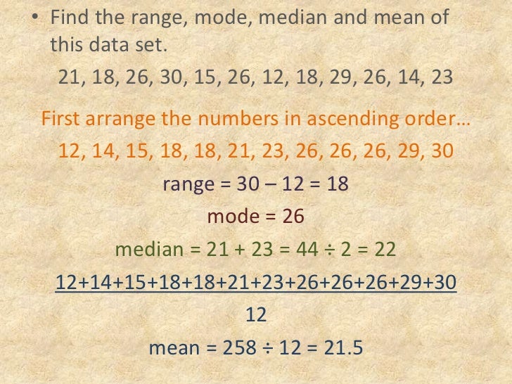 To see an example of finding the mean, watch. It is easy to compute. Then subtract the smallest value from the largest value in the set. 15, 15, x, 30, 35, 41 Calculate the mean (average) of each data set.